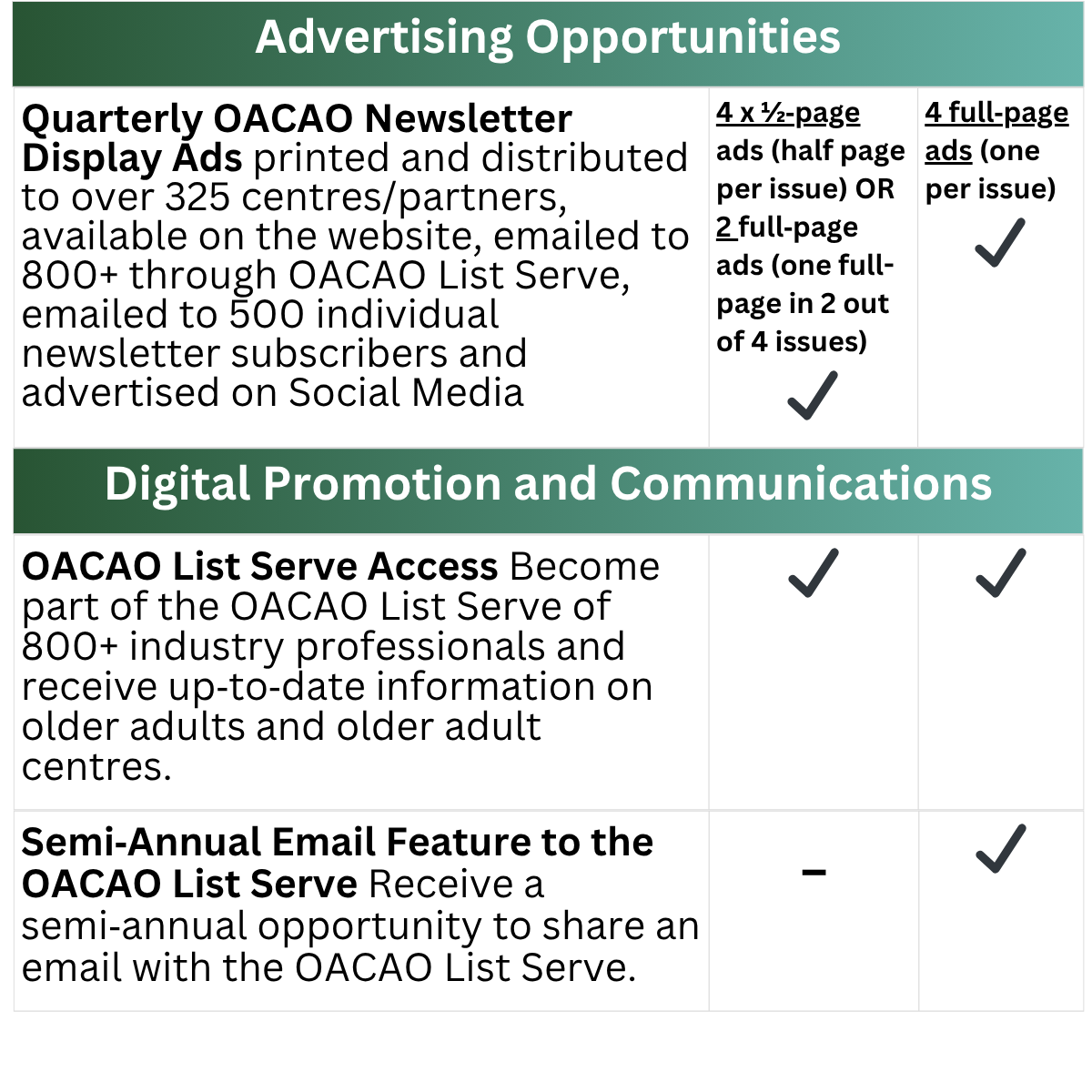 While participation does not include access to OACAO member data or direct email marketing lists, the program provides multiple avenues to build awareness, demonstrate value, and engage authentically within a sector that looks to the OACAO for guidance, collaboration, and best‑practice leadership.