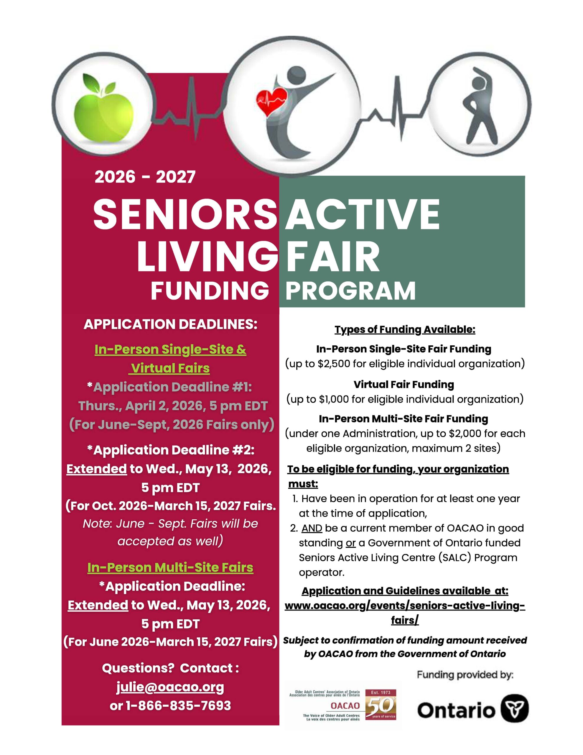 The Older Adult Centres’ Association of Ontario (OACAO) has been gratefully partnering with the Ministry for Seniors and Accessibility (MSAA) on a contractual basis for over nineteen years, to coordinate the development and operation of Seniors Active Living Fairs (hereafter referred to as “Fairs”) throughout Ontario. The 2025 – 2026 Seniors Active Living Fairs Funding Program is underway with acknowledged funding from the Government of Ontario.