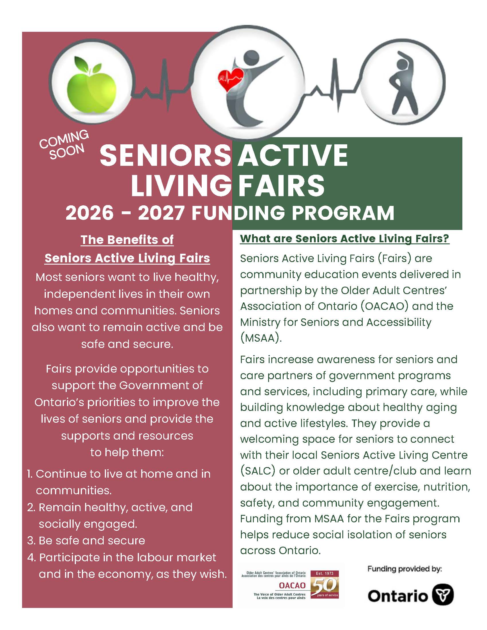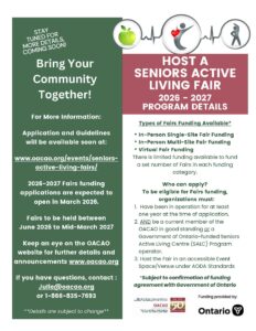 The Older Adult Centres’ Association of Ontario (OACAO) has been gratefully partnering with the Ministry for Seniors and Accessibility (MSAA) on a contractual basis for over nineteen years, to coordinate the development and operation of Seniors Active Living Fairs (hereafter referred to as “Fairs”) throughout Ontario. The 2025 – 2026 Seniors Active Living Fairs Funding Program is underway with acknowledged funding from the Government of Ontario.